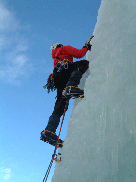 Om vinteren kan du få være med og klatre i frosne fossar. Det er ei oppleving du seint vil gløyme. Vi startar med enkle fossar og avanserer etter kvart som du er klar for det. Her ser vi klatring på led. Det vil seie at førstemann set sikringar og klatrar utan å være sikra frå toppen. Når vi arrangerer isklatring blir du sikra frå toppen (topptauklatring). Vi kan også arrangere kurs der du lærer å klatre på led i foss. |